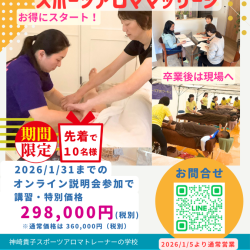 【10名様限定】九州スポーツアロママッサージ講習会・<2026/1/31まで>オンライン説明会参加で、講習費が298,000円(税別)※6万円以上もおトク!