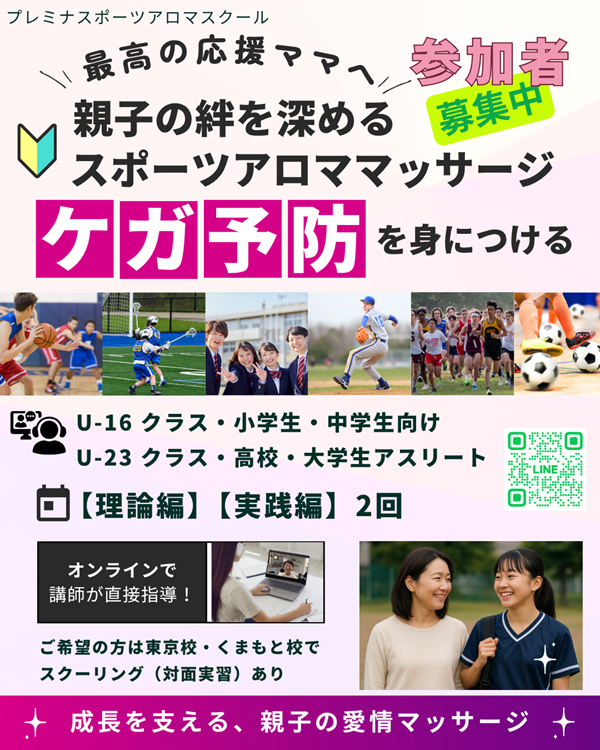 ゴールデンエイジのスポーツ活動を支えるために必要な知識を学ぶ。また、成長期の怪我の予防や、痛みのケアに自宅でできる本格的なスポーツアロママッサージを身につける