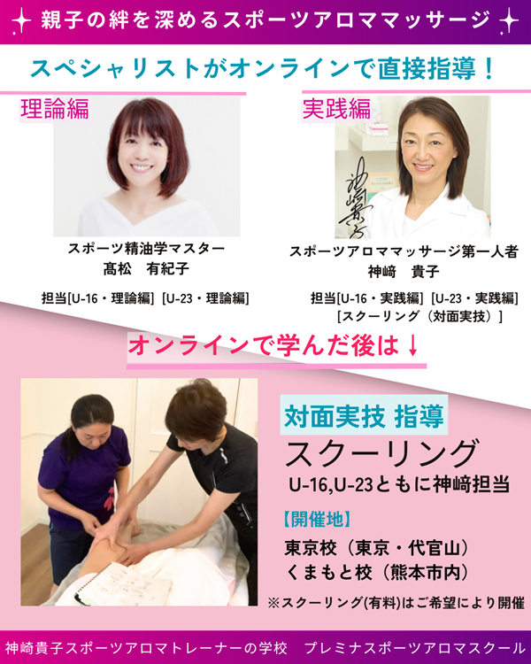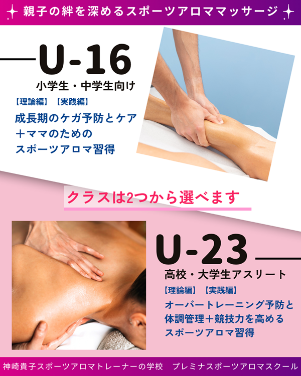 - U16(主に小・中学生対象)とU23(高校・大学)を対象に、各年齢でケガ予防ができるスポーツアロママッサージをご紹介します。すぐに実践で活かせます!