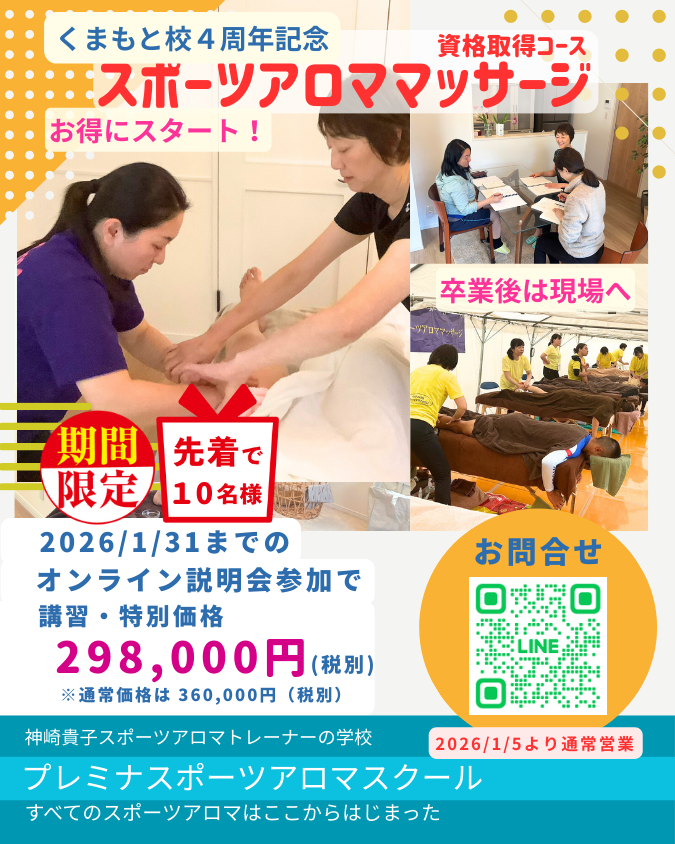 【くまもと校限定】スポーツを支えるあなた必見!選手のケアに役立つ「スポーツアロママッサージ講習会ー資格取得コース」を6万円以上もオトクな特別価格でご案内します。今こそプロの技術を学び、支える力をアップデートする絶好のチャンスです。スポーツ現場で即戦力となる一生モノのスキルを、この機会をお見逃しなく!